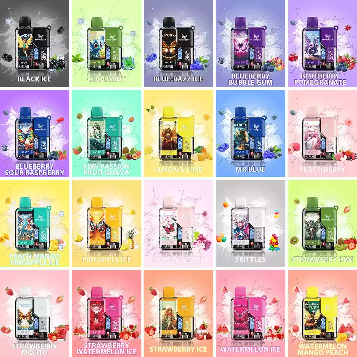 De JNR BUTTERFLY 8500 PUFFS onderscheidt zich door de unieke Boost Mode. Door tweemaal te tikken, activeer je een krachtigere dampbeleving – perfect voor wie extra throat hit of intensiteit zoekt. De digitale display houdt je altijd op de hoogte van je batterij- en vloeistofniveau.