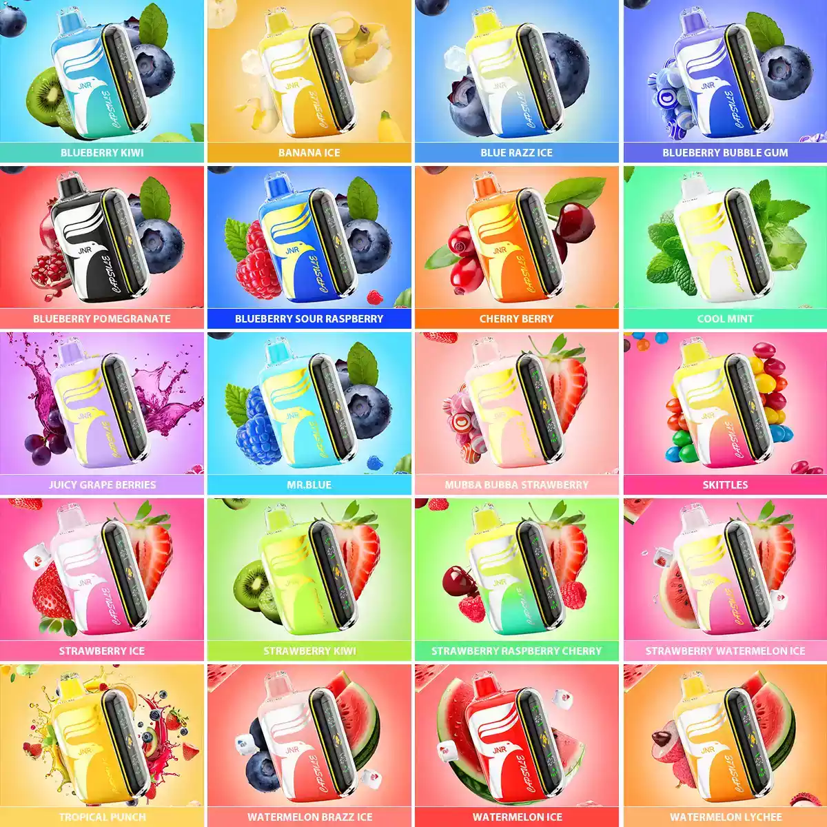 De JNR Capsule 15000 PUFFS is verkrijgbaar in maar liefst 20 heerlijke smaken – ideaal voor zowel beginnende als ervaren vapers: