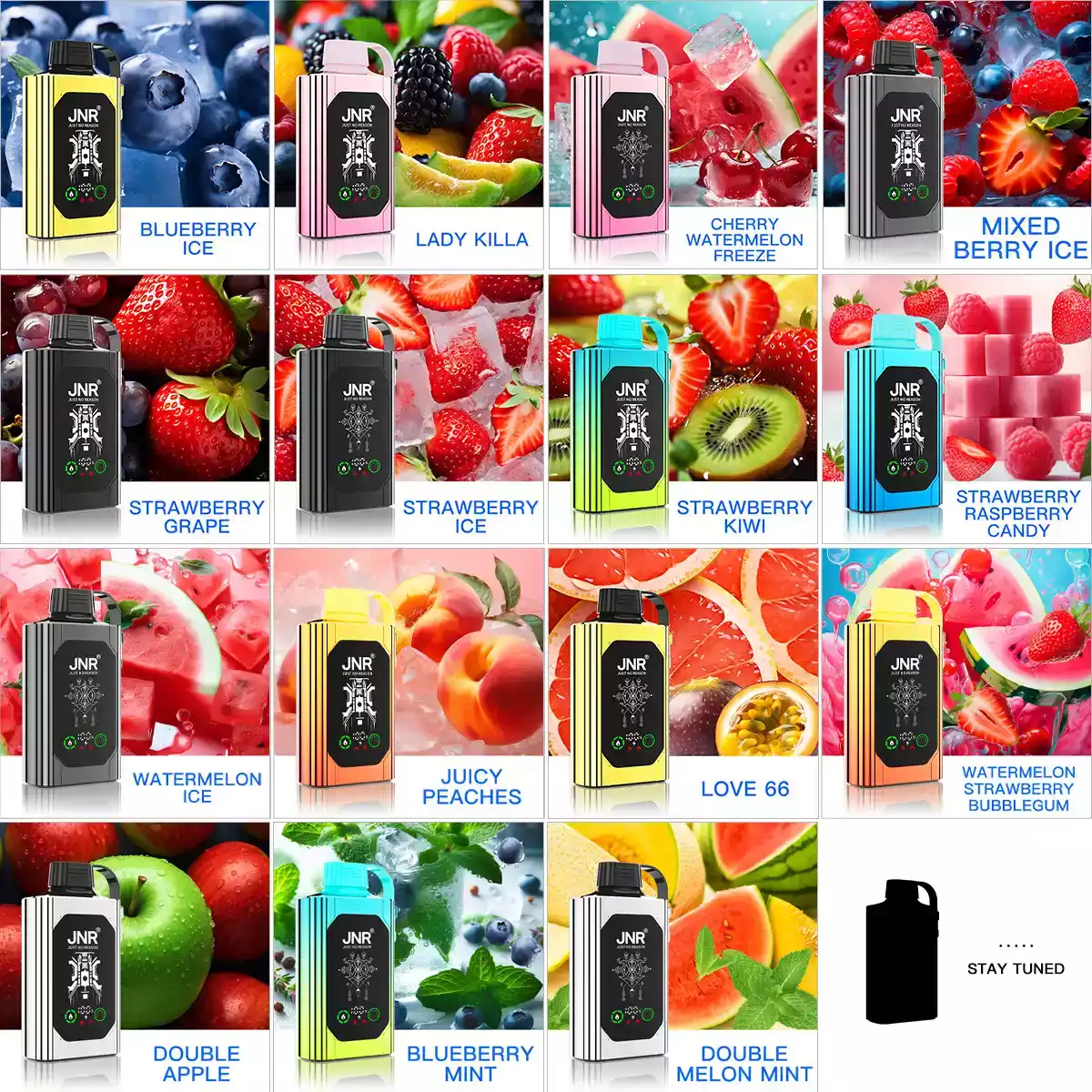 De JNR SHISHA BOX 15000 PUFFS biedt een indrukwekkend palet van 15 smaken, van fris tot fruitig: