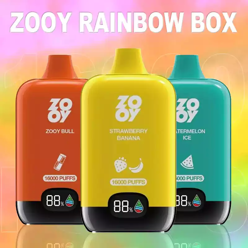De ZOOY RAINBOW 16000 Puffs Disposable Vape biedt 16000 trekken, 26ml e-liquid, slim display en snelle Type-C oplaadbare batterij.